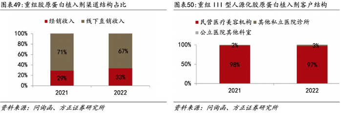 重组胶原蛋白植入剂以线下直销&民营机构为主。1)线下销售为主,无线上销售。2)销售模式以直销占比为主,2022年直销渠道销售占比67%;3)主要客户为民营医疗美容机构,2022年民营医疗美容机构贡献收入达97%。