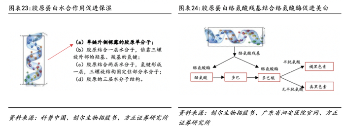 胶原蛋白具有保湿、美白功效。氨基酸片段、肽链及亲水基团赋予胶原蛋白修复、保湿、美白、抗衰等功效,如脯氨酸可刺激细胞迁移并有助于新的组织发育;胶原蛋白外侧亲水羟基基团极易与水形成氢键,起到保湿作用;酪氨酸残基可竞争结合酪氨酸酶,抑制其活性,减少黑色素形成促进美白等。