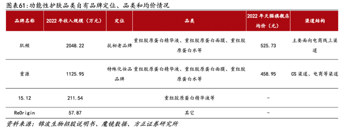 肌频、重源产品定位各自有别,定价400-500元价格带。1)肌频定位抗初老品牌、重源定位特殊化妆品品牌。2)定价来看,根据魔镜数据,肌频和重源定位400-500左右价格带,价格偏高。2022年肌频天猫旗舰店定价526元、重源旗舰店定价为459元。3)渠道:肌频面向电商线上渠道推出,重源面向CS和电商等渠道。