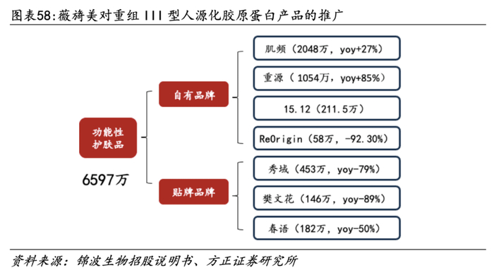 三类械稀缺性凸显,多应用布局渐入佳境。公司团队调整,已释放商业化加速的信号,分应用来看:1)三类械:当前获批三类械的重组胶原蛋白注射剂仅薇旖美重组人源化胶原蛋白植入剂,产品100%与人胶原蛋白序列同源,较动物源胶原蛋白产品没有排异反应,优势突出。短期来看竞争格局稳定,具备抢占份额、开拓疆土的窗口期。2)二类械敷料:重组胶原蛋白修复敷料销售额为1.31亿,OBM+ODM模式,自有品牌以薇旖美、薇芙美为主。3)功能性护肤品:原料研发反哺功效护肤品,新材料驱动新品迭代。功效护肤品产品以重组胶原蛋白、多肽为核心成分,肌频、重源等多个品牌定位有别、形成矩阵。4)医用:主要为重组胶原蛋白黏膜修复敷料、抗HPV生物蛋白敷料等妇科产品。