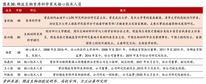 首席科学家姜世勃、首席科学顾问张兴栋带队,核心技术人员经验深厚。首席科学家姜世勃微生物学专业博士研究生出身,当前是复旦大学上海医学院医学分子病毒学教育部/卫健委重点实验室教授,主要从事抗病毒药物及疫苗研究;张兴栋院士为公司生物材料首席科学顾问,现任四川大学教授,2007年当选中国工程院院士。公司核心技术人员为实控人杨霞、陆晨阳、兰小宾、何振瑞,具备丰富的研发经验。