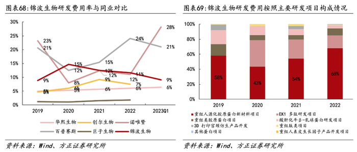 公司研发费用高比例投入在重组胶原蛋白产品。2022年68%研发费用均投入于重组人源胶原蛋白新材料项目,17%研发费用投入于EK1多肽研发项目。