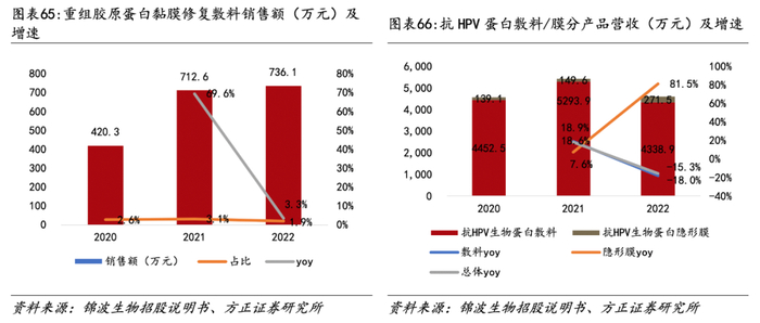 2)抗HPV生物蛋白敷料/膜销售额为4670万元,增速为-15%。其中抗HPV生物蛋白隐形膜增长较快,从2020年的199.1万元的销售额增长至2022年的271.5万元,2020、2022年增速分别为7.6%、81.5%。