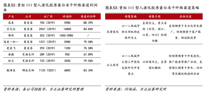 重组Ⅲ型人源化胶原蛋白冻干纤维定位稀缺、竞争格局优异。当前获批三类械的重组胶原蛋白注射剂较少(6款),除薇旖美外均来源于动物源胶原蛋白。根据招股书,2022年重组III型人源化胶原蛋白冻干纤维毛利率为93.37%,体现出该产品渠道议价权较高。