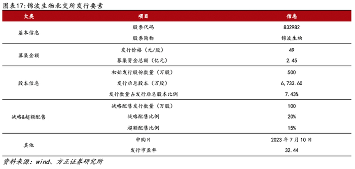 IPO发行价49元/股,发行市盈率为32.44倍,公开发行股票数量为500万股,拟募资2.45亿元。此次IPO公司引入三家战投。中信证券锦波生物员工参与北交所战略配售1号集合资产管理计划、晨鸣(青岛)资产管理有限公司、新长期(海南)私募基金管理有限公司分别拟认购2450万元、1347.5万元、1102.5万元