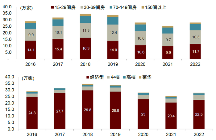 疫情中单体酒店供给加速出清、格局优化。疫情之下抗风险能力较强的头部连锁酒店集团优势凸显,而一些单体酒店由于自身运营管理、客源渠道、资金支持等多方面能力相对薄弱,在疫情影响下退出市场或加入连锁品牌。经过此轮单体酒店的出清与翻牌,行业中的抗风险能力薄弱、现金流管理较差的经济型和小房量酒店(15-69间房)在20-21年大幅减少。在商旅休闲需求反弹后,我们认为单体酒店供给会在一定程度上出现回归的情况,但考虑到疫情下消费者对卫生条件、品质的要求所提高,对品牌酒店认可度提升,单体酒店供给恢复对整体行业供给影响有限。纵观22全年,我们观察到连锁酒店和非连锁酒店均出现一定供给提升,其中连锁酒店数量增加较为显著。随着加盟商情绪逐渐回暖后,我们认为连锁酒店供给有望持续回升。