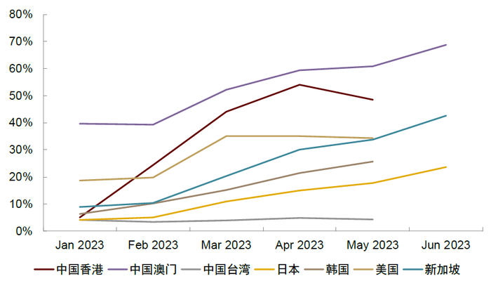 出入境旅游稳步复苏,但仍受制于部分供给侧因素。移民局统计端午假期入出境人数日均132.1万人次,较22年同期增长约2.3倍,较19年同期恢复超六成[4]。5月中国大陆出境至中国香港和中国澳门人次较2019年同期恢复程度分别为48.5%和60.8%。目前我们观察到出入境供给侧端仍未恢复到疫情前水平:一是国际航班:据航班管家数据,7/3-7/9国际和地区客运航班量分别恢复至19年同期约46.5%和55.2%[5]。二是签证:据签证服务机构vfs global数据,截至今年5月,中国公民签证申请量已恢复至疫情前同期的35%,vfs global预计到今年底签证申请量将恢复至疫情前同期的40%-45%;欧洲部分国家签证预约已排队至8月底,美国面签预约排队至11月初[6]。三是出境游目的地的当地接待设施由于疫情期间停摆时间较长,仍需一定时间爬坡。四是文旅部尚未恢复部分国家出境团队游业务:目前文旅部已分两批恢复中国公民赴60个国家的出境团队旅游业务[7],但日本、韩国等疫情前中国出境人次较多的国家仍未恢复。我们建议关注行业资源和人才供给稳步爬坡下出境游旅行团的进一步复苏。