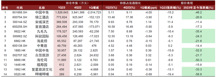 图表:1Q23社服板块重点标的持股明细(按1Q23基金持有市值降序排列)