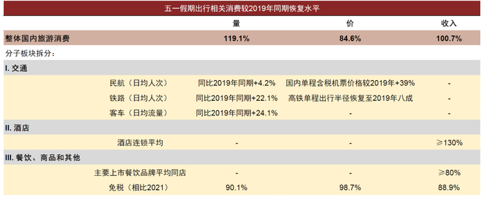 注:1)整体国内旅游消费数据来自文旅部;2)交通板块中量的恢复数据来自交通运输部,其中客车流量数据系高速公路客车流量;3)交通板块中价的恢复数据来自携程;4)酒店收入恢复数据采用我们估算的华住、锦江、亚朵的RevPAR恢复程度平均值;5)免税相关数据同2021年进行比较;6)餐饮收入恢复数据采用我们估算的太二、九毛九西北菜、海伦司、湊湊、百胜中国的同店收入较2019年恢复程度和海底捞同店翻台率较2019年恢复程度平均值