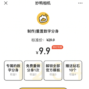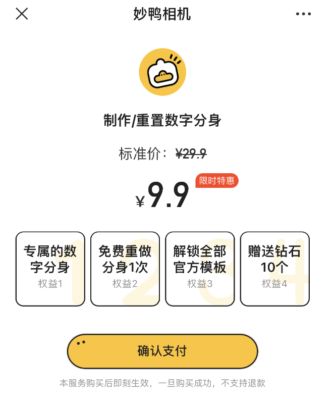 打开妙鸭相机小程序,首先需要上传一张正面照片,随后补充至少20张照片,在该步骤,系统会提示照片是否达标,已上传照片的质量超过多少百分比的用户,用户可以选择补充更多照片,让“数字分身”效果更棒。上传照片后,用户需关注妙鸭相机公众号,完成付费流程,标准价是29.9元,限时特惠9.9元,一旦购买成功,不支持退款。