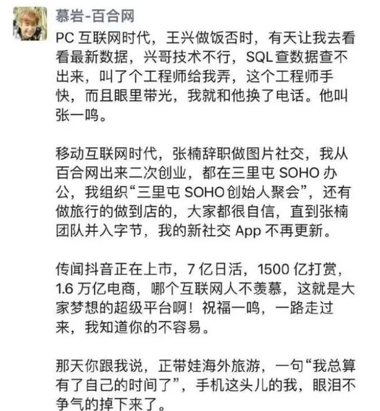 因此,在未得到回应后,慕岩将矛头指向了张一鸣。据网络截图显示,慕岩在朋友圈声称要撰写特稿《百合创始人的抖音亲历记》,发布在微博和公众号上。对此,目前张一鸣及张楠、抖音官方均未回应。
