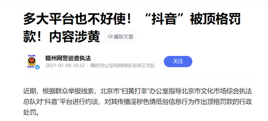 而据赣州网警巡查执法百家号信息显示:2021年,“抖音”还曾被北京市“扫黄打非”办公室文化市场综合执法总队约谈并进行了顶格罚款,原因是内容涉黄。