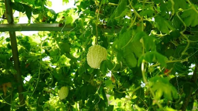 在金山区枫泾镇九丰农业基地,放眼望去,晶莹剔透如白玉般的苦瓜吊在空中,在绿色藤蔓的映衬下,甚是好看。
