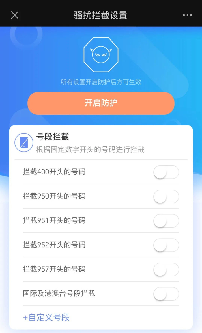 在“中国移动高频骚扰电话防护”微信公众号上,用户可以选定精准号段拦截,如拦截400、950、951等开头的号码,以及拦截国际及港澳台号段。如果有个性化需求,市民也能自定义设置需要拦截的号段。