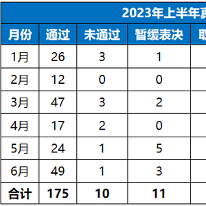 接下来,我们再来看看过会率的情况。根据wind,2023上半年国内A股市场共有196家企业IPO上会,其中175家过会,10家被否,11家暂缓审议,计算得到的过会率为89.29%。
