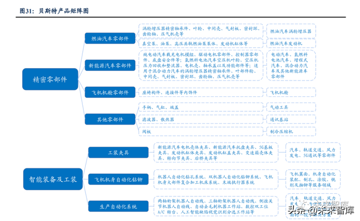 1)智能装备中,工装夹具是公司创立之初首发产品,经过 20 余年的发展,向着感 知、智能、自适应、数字化方向发展新一代智能夹具;2)涡轮增压零部件:公司是国内涡轮增压器零部件龙头,主要产品包括涡轮增压 器精密轴承件、叶轮、中间壳、压气机壳、发动机缸体等,与盖瑞特、康明斯、博格华 纳、三菱重工等全球领先的涡轮增压器和发动机相关制造企业建立了长期稳定的业务合 作关系。受益于涡轮增压器自身渗透率的提升&混动车高搭载率带来的增量,公司涡轮 增压器板块有望保持稳健增长。3)新能源汽车零部件:公司依托精密加工能力,积极布局新能源汽车领域,主要产 品包括纯电动汽车载充电机模组、驱动电机零部件、控制器零部件、底盘安全件等以及 氢燃料电池汽车空压机叶轮、空压机压力回收和整流器、电机壳、轴承盖以及功能部件 等新能源汽车零部件。
