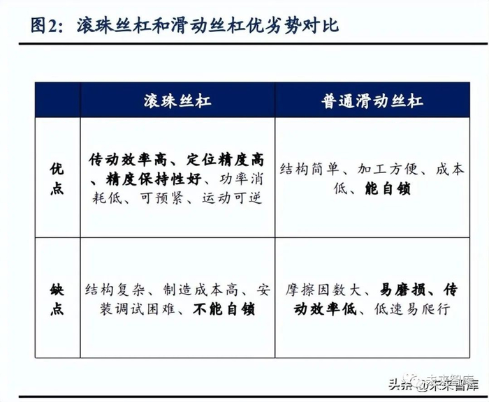 相较普通滑动丝杠,滚珠丝杠使用滚珠传递运动,具有传动效率高、定位精度高和 传动刚度大等明显优势。滑动丝杠的优点在于结构简单、加工方便、成本低和能自锁, 缺点是摩擦阻力大,易磨损,传动效率低。目前已逐步被滚珠丝杠所替代,但在部分需 要自锁功能和对精度传动效率要求不高的场景仍有应用。