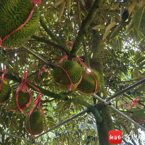 走在世界热带水果之窗基地榴莲种植区,果树上的榴莲被“五花大绑”得格外显眼,此举旨在防其掉落。金枕头榴莲正在膨大,越南干尧正在加快成熟。