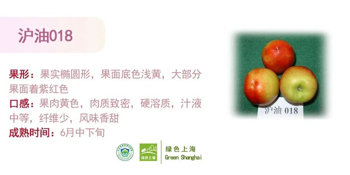 沪油018、沪油004、 沪油005是上海市农业科学院林木果树研究所至今育成的综合性状优良的油桃品种,多以设施栽培为主。沪油005是6月上中旬成熟,沪油004是6月中旬成熟,沪油018则在6月中下旬成熟。主要集中在奉贤及崇明的瑞华果园。