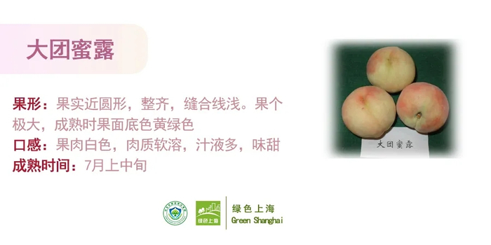 时至今日,上海培育出了以“大团蜜露”、“新凤蜜露“、“湖景蜜露”为代表的三大桃品种,形成了新一代的“上海水蜜桃”。好品牌源于好品质。那三种品种桃有何区别?请看下图。