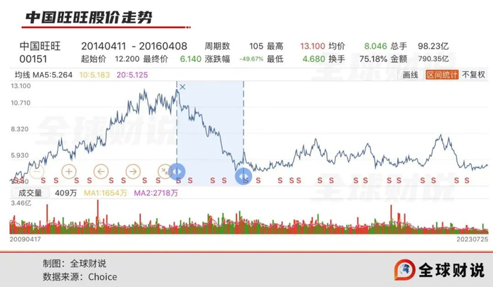 盛衰有时,在所难免。虽然中国旺旺2022财年营收规模重回十年前水平,但在二级市场却已不负往日。截至7月25日,中国旺旺报收5.33港元,总市值633亿港元,较2014年最高时蒸发超900亿港元。