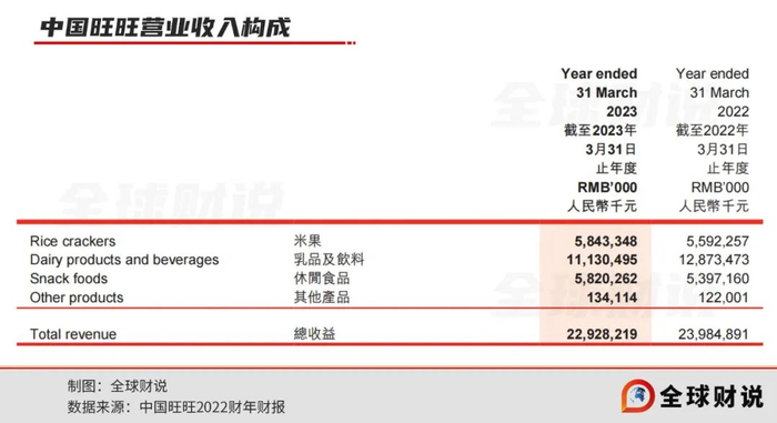 值得一提的是,根据往期报告显示,“乳品及饮料”类别中旺仔牛奶营收占比超9成。而在2022财年,旺仔牛奶销售额呈双位数下滑。