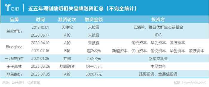 兰熊鲜奶早在2019年和2020年就先后完成天使轮和Pre-A融资;Blueglass曾在2021年一举拿下超2亿元B轮融资,同年,新希望乳业以2.31亿元的价格收购了一只酸奶牛60%的股权;即便是在消费融资并不活跃的2023年,也先后有王子森林、丽茉酸奶获得融资。