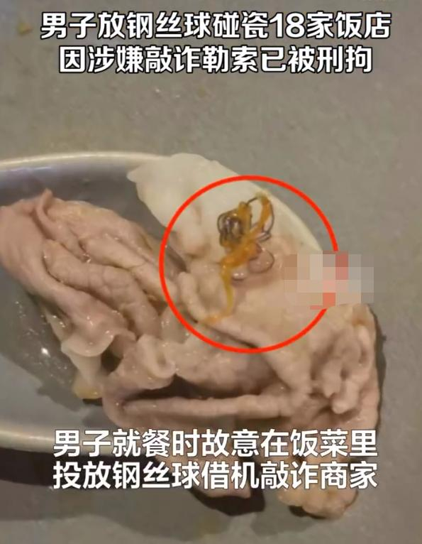 今年5月,内蒙古呼和浩特一名男子在就餐时故意将钢丝球投放在饭菜里,借机敲诈商家。据悉,该男子多次在不同餐厅行骗,共涉及18家饭店。直到最终有商家勇敢地站出来报案,他的敲诈行为才得以曝光。