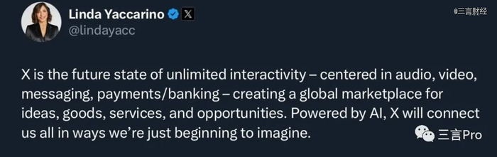 今年7月24日,新上任的推特CEO Linda Yaccarino发推称,X是无限交互的未来形态,以音频、视频、消息、支付/银行为中心,为创意、商品、服务和机会创建一个全球市场。在人工智能支持下,X将会连接所有人。