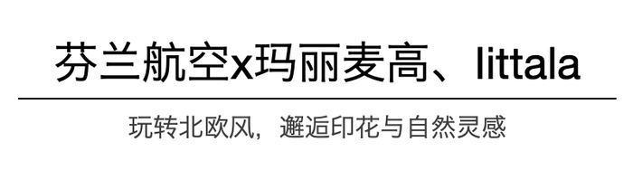 搭乘芬兰航空长途航线公务舱旅行时,乘客将得到玛丽麦高设计的便携式旅行套装——共有八款美观、具有收藏价值的玛丽麦高印花设计。Marimekko 最著名设计师之一Maija Isola,在她38年的职业生涯中创造了多种标志性图案,该“旅行套装”系列运用了四款经典图案:Joonas、Rautasänky、Pieni Melooni 和 Jenkka。