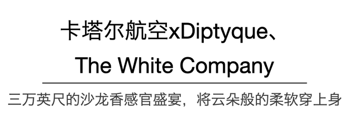 2022年,卡塔尔航空推出了全新的Diptyque洗漱包,其中包括Diptyque品牌的收纳包,以及印有其象征性椭圆图形品牌礼盒,分男士及女士两款。Diptyque是来自法国的知名香氛品牌,也是世界沙龙香氛的代表之一,瓶身采用透明玻璃以及手绘图腾的设计,不用多着笔墨就能让人眼前一亮。