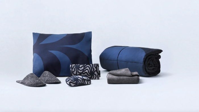 其中的袋子与搭配的睡眠眼罩均采用光滑提花面料精心制成,旨在提供放松飞行体验,且在下机后还可循环使用。