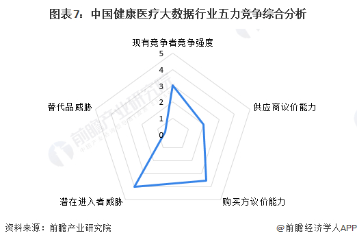 运用波特的“五力”模型,对健康医疗大数据行业的竞争环境分析中,对各方面的竞争情况进行量化,5代表最大,0代表最小,健康医疗大数据行业的竞争情况如下图所示: