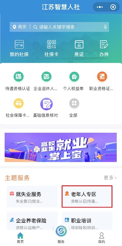 登录“江苏智慧人社”手机APP或微信小程序,选择首页“老年人专区”,点击“企业养老金调整情况查询”。