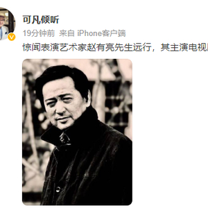 7月26日,主持人曹可凡“@可凡倾听”微博发文,曾主演《孽债》《夺子战争》等经典作品的著名演员赵有亮去世,终年79岁。