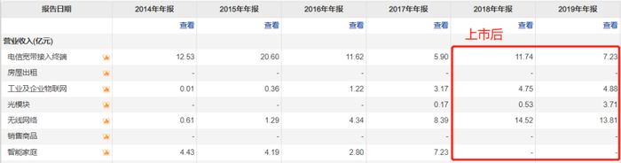 公司2017年11月上市A股,在上市前,主营为电信宽带接入终端业务,这一块业务占比在2015年之前增长还是比较稳定,占比公司总收入75%以上,国内和境外都有客户,但重心在国内,受益于通信基础设施建设和宽带接入的需求较好,不过2016年开始,国内业务出现明显下滑,一方面需求降低,另一方面单价下滑,2014年至2016年公司核心产品的平均单价一路下跌从159.71元、121.19元跌至112.32元。2017年接入终端业务已经从2015年的20亿收入下降至5.9亿,也得益于当年的转型,无线网络设备和智能家庭业务网关收入增长,将公司从2016年的业绩阴影中拯救出来,2017年才顺利上市。