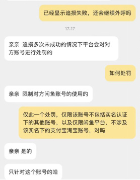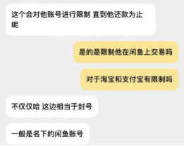 客服人员同时透露,被举报的用户将会面临封号处理,即丧失登陆权限在内的所有权限。在调查人员进一步追问处理的是什么账号,以及可能绑定的淘宝账号和支付宝账号是否会受到限制时,客服表示处理只限于闲鱼平台的这一账号,对于其他账号无法处理。
