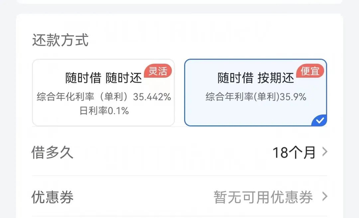 回到文章开始提到的借款产品。富宝袋宣传的最高额度20万元,综合年化利率(单利)6%起,注册用户超1000万,但实际上借款人经过一系列操作后看到的产品如下图所示,年利率高达35.9%: