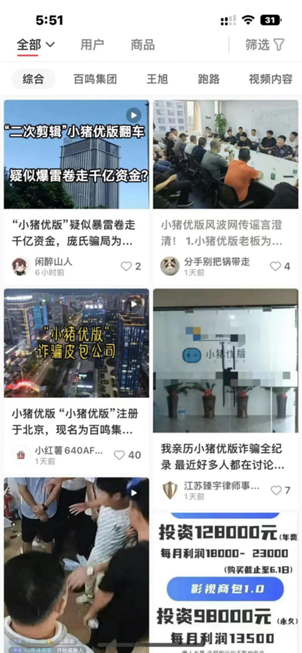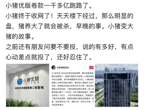 各大社交媒体、短视频平台不少用户爆料知名短视频创作平台小猪优版崩盘,总部人去楼空,老板卷款1600亿“跑路”,上万人原地失业,投资人损失上亿...