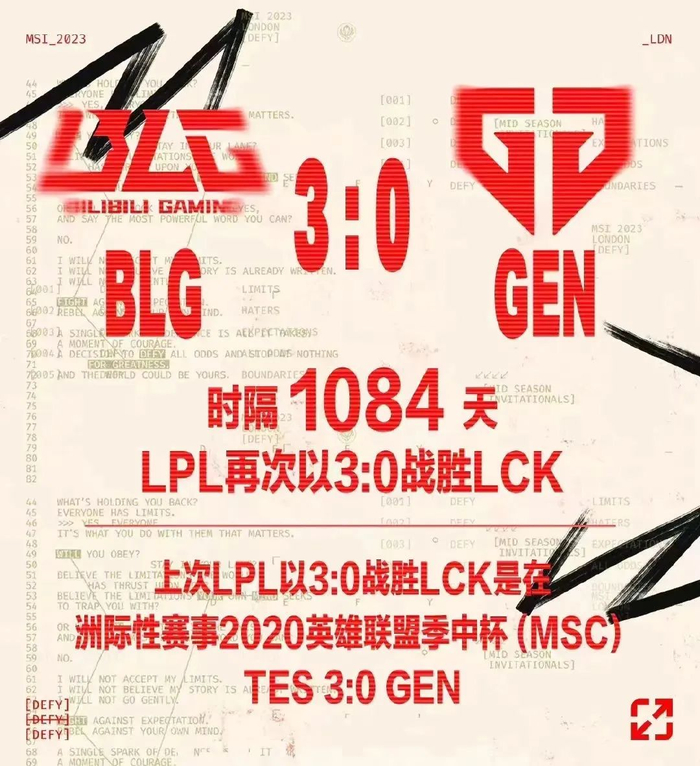 而在MSI的比赛过程中,BLG淘汰韩国队GEN和T1两场尤其精彩。在对战GEN前,前《英雄联盟》人气选手Doinb预测BLG将被1:3大比分淘汰。没想到,BLG以3:0的成绩碾压GEN,打得对手无力招架。这也是LPL赛区(中国区)的战队时隔1084天,再次以3:0战胜LCK赛区(韩国区)的战队。