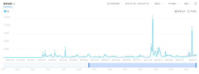 因此从百度指数看,BLG战队有两个搜索峰值,分别是2021年12月和2023年5月。前者正是BLG官宣签约传奇选手UZI。此外,Crisp、Breathe等人气职业选手的加盟,也给BLG贡献了不少谈资。