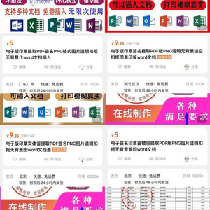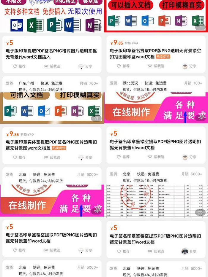 阿文介绍,目前该平台的实习证明作假主要采用三种制作假章的方式。第一种是买家向卖家发送意向单位的公章照片,卖家通过PS软件将公章图抠下,粘贴在买家的实习报告上,价格在5-15元不等;第二种是卖家根据买家提供的公章照片新仿制一个“电子章”,因作图难度提升,价格从十几元到几十元不等;第三种是刻实体章,价格是三者中最高的,100-200元包邮到付。“不管什么公司的章都能给你做,不会因为做大公司的章就多收钱,我们是按难度来算钱的。”面对记者提出的安全问题,阿文说,“我做这个很多年了,没听说有什么问题,也没人被发现。”