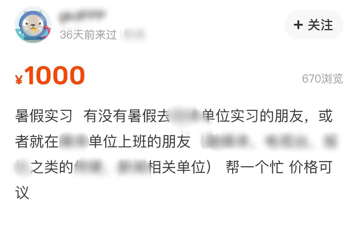 在某闲置交易平台上,记者看到,有不少求购实习证明的买家,他们发布了“蹲帮忙盖实习章”“蹲XX类型单位盖章,价格可议”等求购帖,有的标价30元,有的愿意花费1000元,不少人还以9999元“重金”吸引眼球。