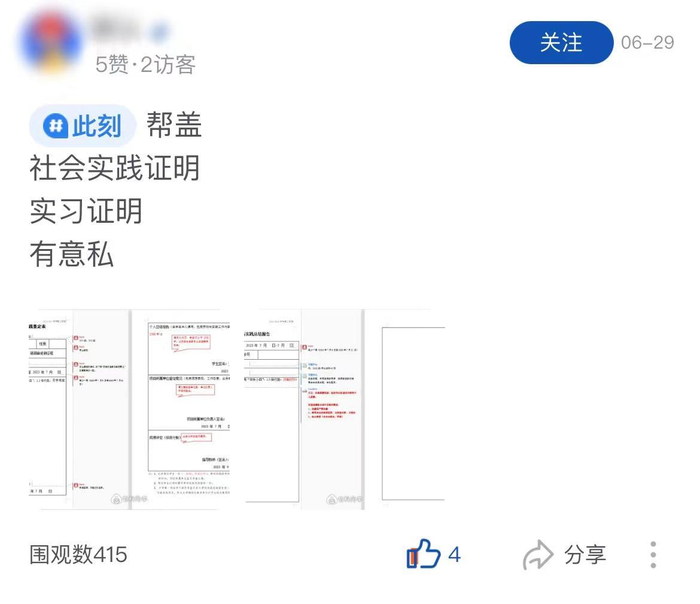 某生活方式平台也不乏实习证明的买卖现象。卖家和买家给发布的内容加上#大学生实践#、#大学生实习#等标签,很容易便能彼此匹配,私信谈好价格便可下单。卖家金子以200元的价格出售建筑公司盖章服务,因售价偏高,询单者寥寥无几。“没人买也没关系,我本来也不是靠这个赚钱的。”金子说。
