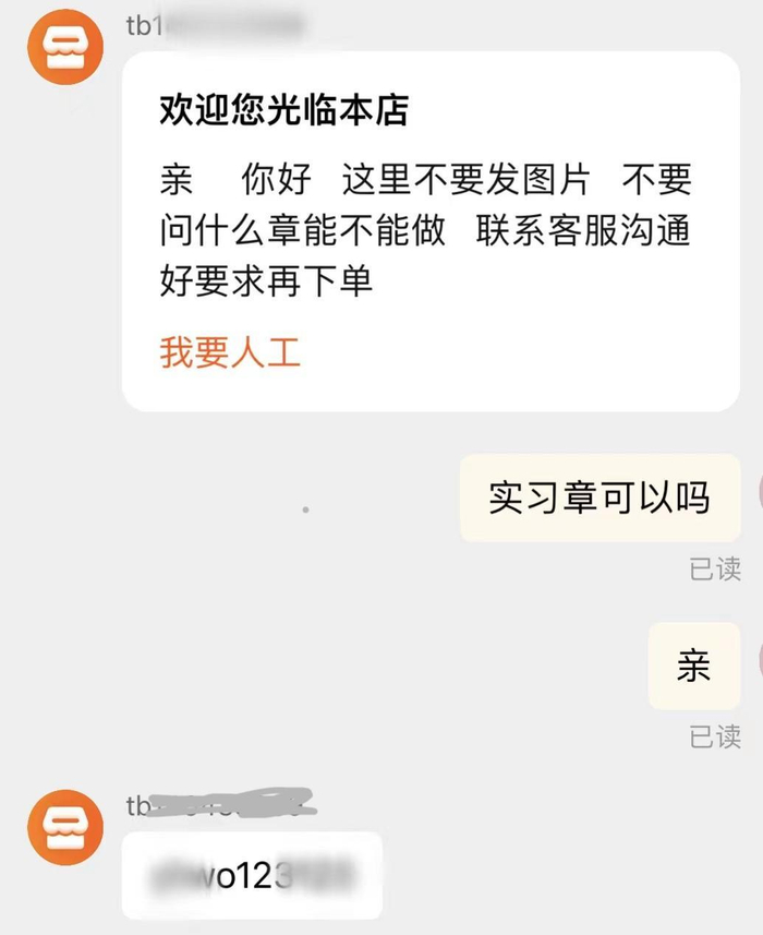 记者假扮大学生,选择一家月销量4000多单的刻章店铺,询问是否可以开具实习证明。商家设置的自动回复提示询单者“添加微信,不要在这里发送图片”。添加微信后,卖家阿文向记者保证“不会泄露你的隐私,也不会过问你刻章的用途”。