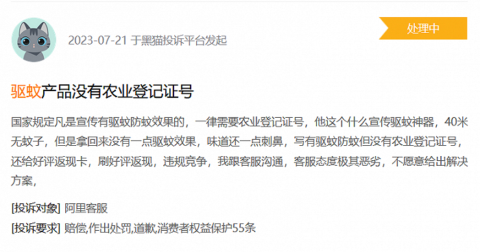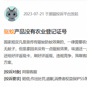 但事实上,许多驱蚊产品的生产厂家未进行农药登记,以“驱蚊”为关键词可以在黑猫投诉上搜出1145条投诉记录,几乎所有涉及虚假宣传的投诉都会提到厂家没有农药登记证。