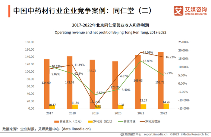 同仁堂营业收入和净利润于2019年持续下跌,2021年后回涨,整体呈现增长趋势。2022年,同仁堂实现收入153.72亿元,同比上升5.27%;归母净利润14.26亿元,同比增加16.22%。艾媒咨询分析师认为,同仁堂凭借多元化的产品组合、良好的品牌口碑、研发创新和市场拓展等因素,实现了收入的增长。未来,随着中药市场的不断发展和消费者对中药的需求增加,同仁堂有望继续保持良好的收入增长势头。