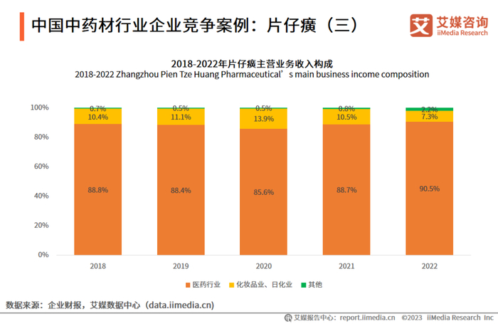 片仔癀主营业务包括医药(医药制造业和医药流通业)、日用品和化妆品等,其中药品是主要收入来源,2022年片仔癀医药行业营收共计78.72亿元,占比接近90.5%,化妆品及日化业占比7.3%。