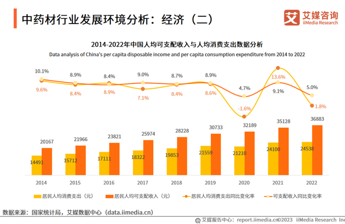 2022年,中国居民人均消费支出24538元,比上年名义增长1.8%。艾媒咨询分析师认为,国家经济发展带动居民消费支出提高,刺激了中药医疗消费需求的增长,推动中药材的品质提升和现代化发展,中药材行业有望在消费升级的背景下迎来更广阔的市场机遇。