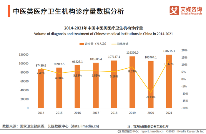 数据显示,2020年之前中医服务需求稳步扩大,2020年诊疗量骤降至105764.1万人次,同比增速低达-9.13%;2021年中医需求继续增大,中医类医疗卫生机构诊疗量达到120215.1万人次。艾媒咨询分析师认为,中医类医疗卫生机构诊疗量总体呈上升趋势,国民对中医治疗需求扩大,中医诊疗服务未来发展潜力或十分巨大。